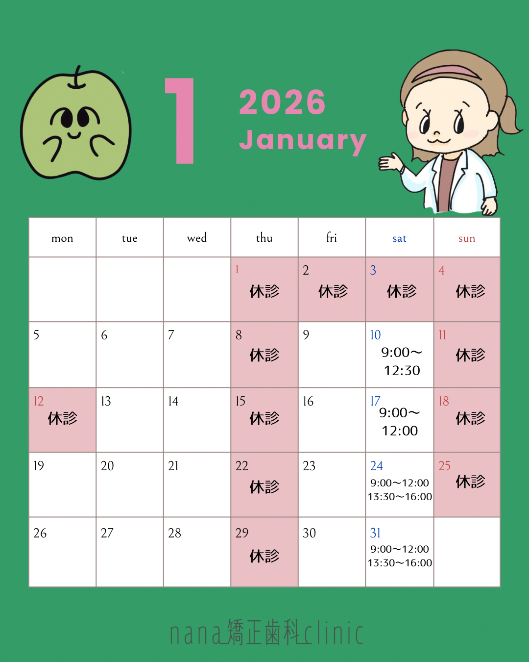2026年1月診療日のお知らせ🍏